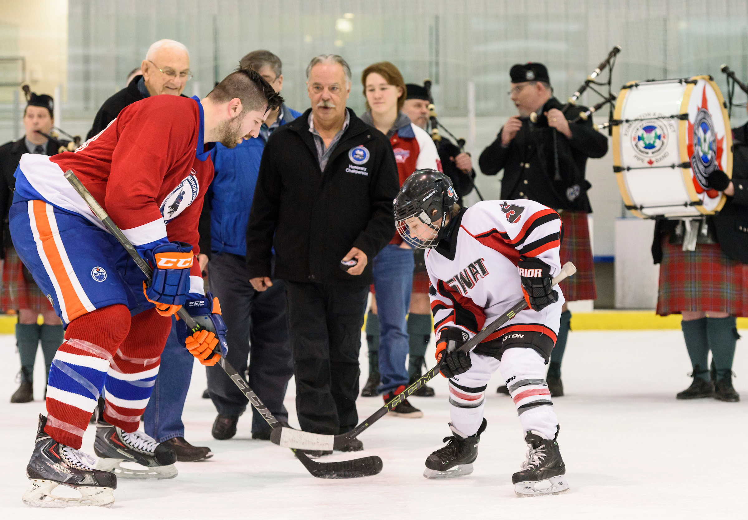 The dignitaries were piped in by the Edmonton & District Pipe Band. Official Puck Drop to begin the 2017 Quikcard Edmonton Minor Hockey Week was done by Bill Ross, longtime Minor Hockey Week Committee member; Mark Doram, Hockey Edmonton President; Chris Hurley, Honourary Chairperson; and Darrell Davis, Minor Hockey Week Chair.