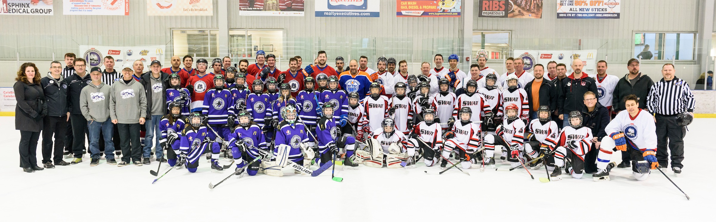 The Oilers' Alumni and Media teams after their game to kick off the beginning of Quikcard Edmonton Minor Hockey Week accompanied by SW662 SWAT Ice Wolves and EG 694 Ice Bears.