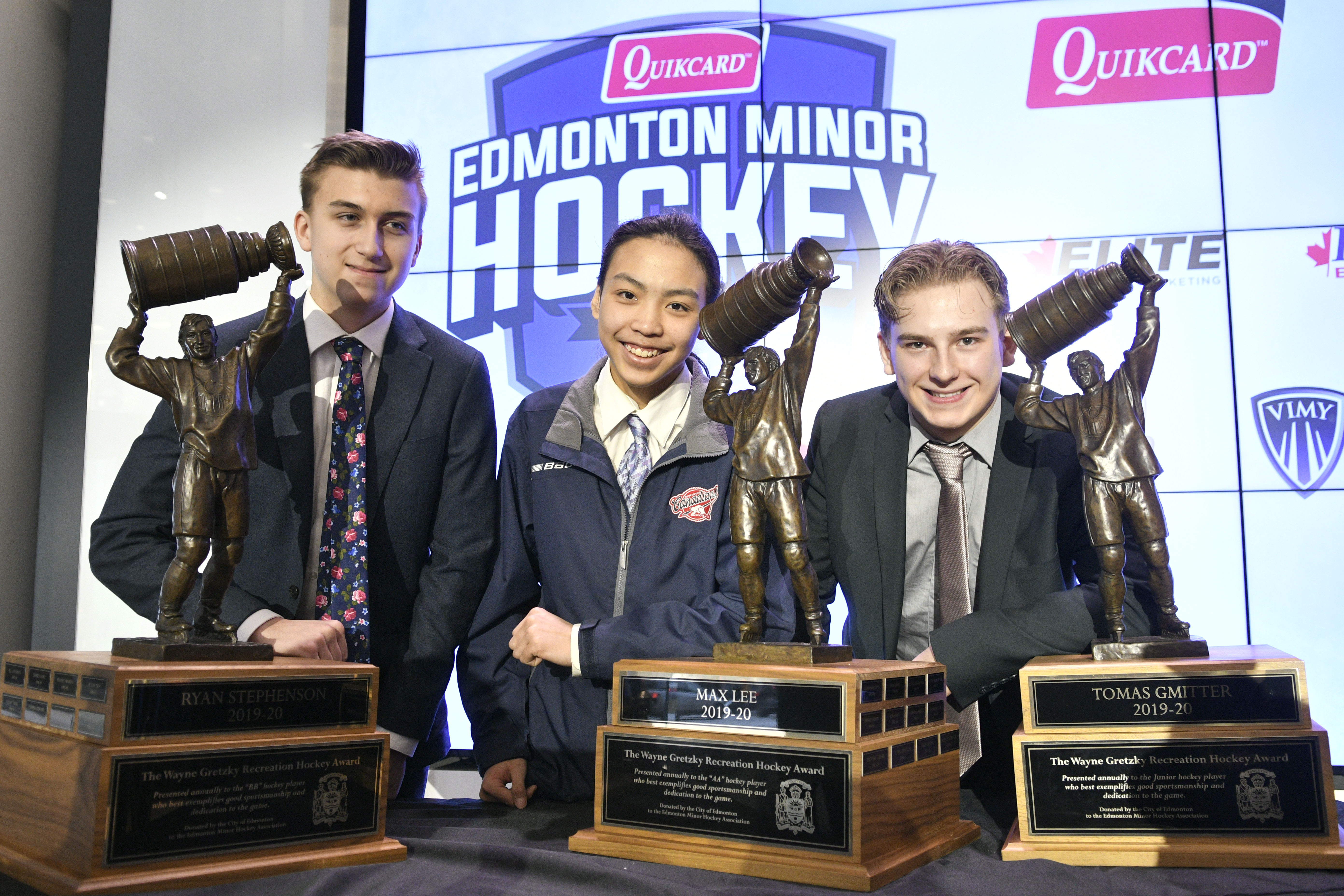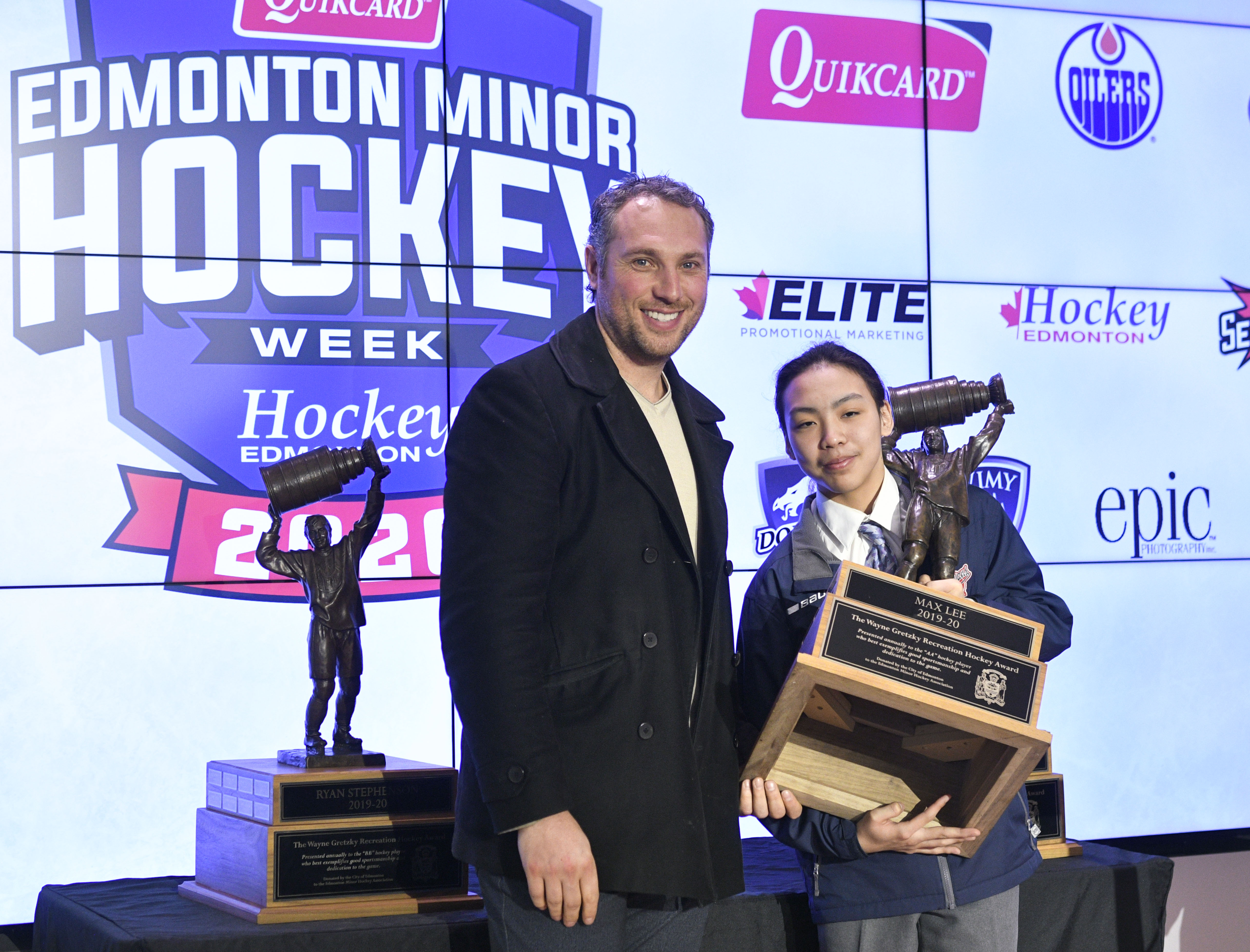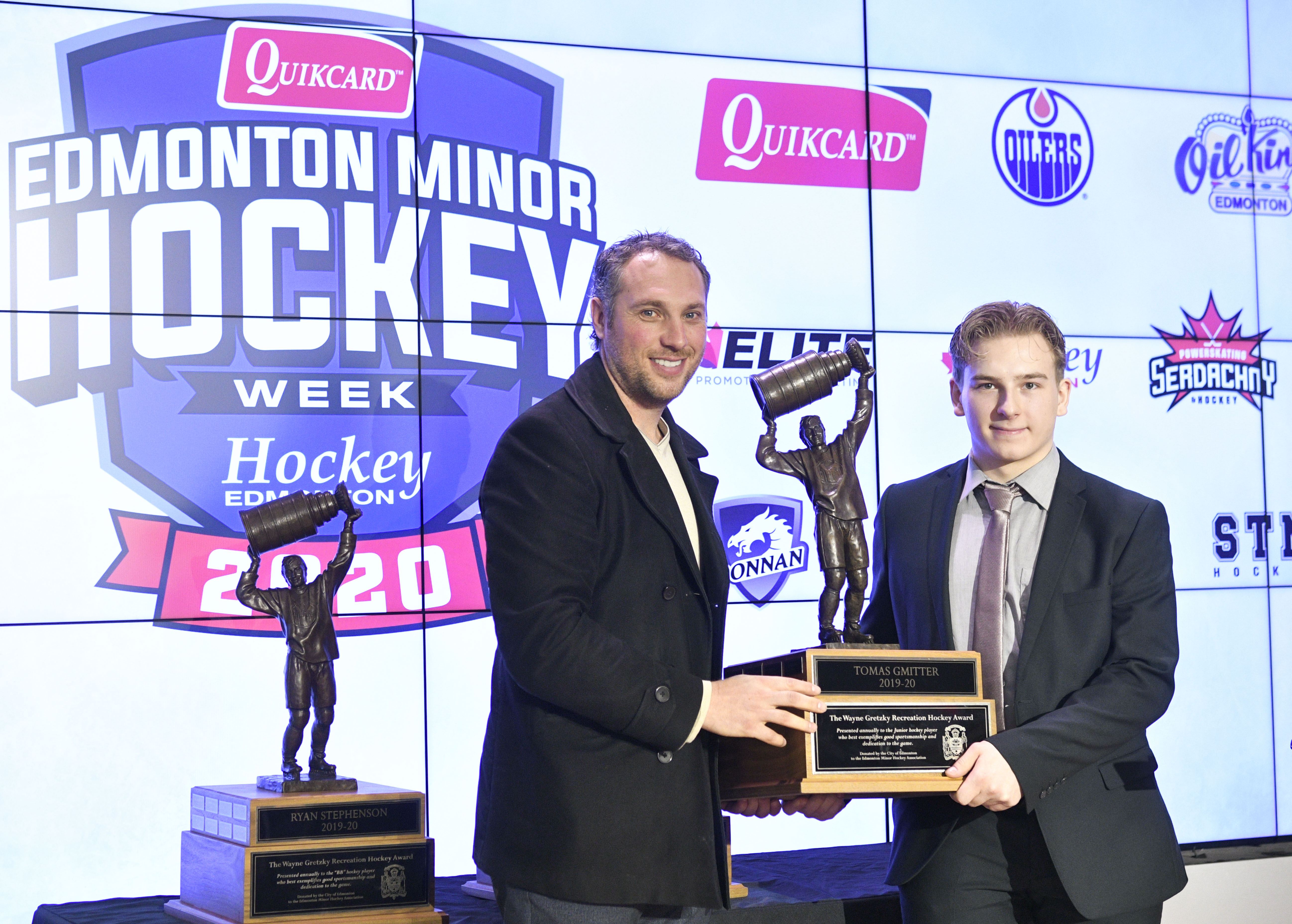 The 2020 Wayne Gretzky Award winners are; Tomas Gmitter (Junior winner), Max Lee (Elite winner), and Ryan Stephenson (EFHL winner). Congratulations to some very deserving young men! Thank you Fernando Pisani, Oilers Alumni for helping present the awrds this year!